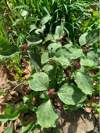 Trillium or Wake Robin appear very early in my woodland garden – most often in March. This native is known for its mottled, three-lobed leaves. From the middle of each set of leaves emerges a flower which has three petals. Mine are an interesting chocolate color. They show up, flower, and then the plant just disappears. That is why it is called an ephemeral.