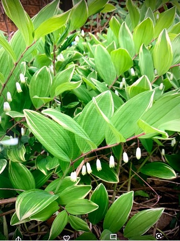 Solomon Seal is also a woodland native but it lasts the whole season. I have a variegated kind, which grows from a rhizome. Early in spring, the arching stems show up with alternate, variegated leaves, green with creamy margins. Soon thereafter, lovely bell-shaped white flowers appear on the underside of the stems. They are one of the most beautiful plants in the early season. After the flowers bloom, the leaves continue with their lovely green presence. This plant does not disappear; in fall it provides creamy yellow fall color to end the season.